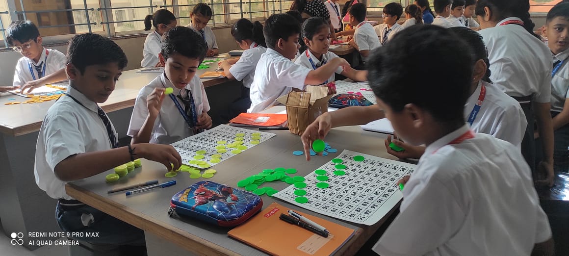 In Classes 5 and 6, Prime Numbers are introduced using number charts and coloured counters. Students mark prime and composite numbers in different colors.