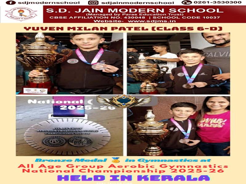 We are proud to share that Yuven Milan Patel of Class VI D of Tagore House represented Gujarat state in Gymnastics in All Age Group Aerobic Gymnastics National Championship 2025-26 held in Kerala on 10th September 2025. He has brought great honour to our school by winning the Bronze Medal at the National Level.
